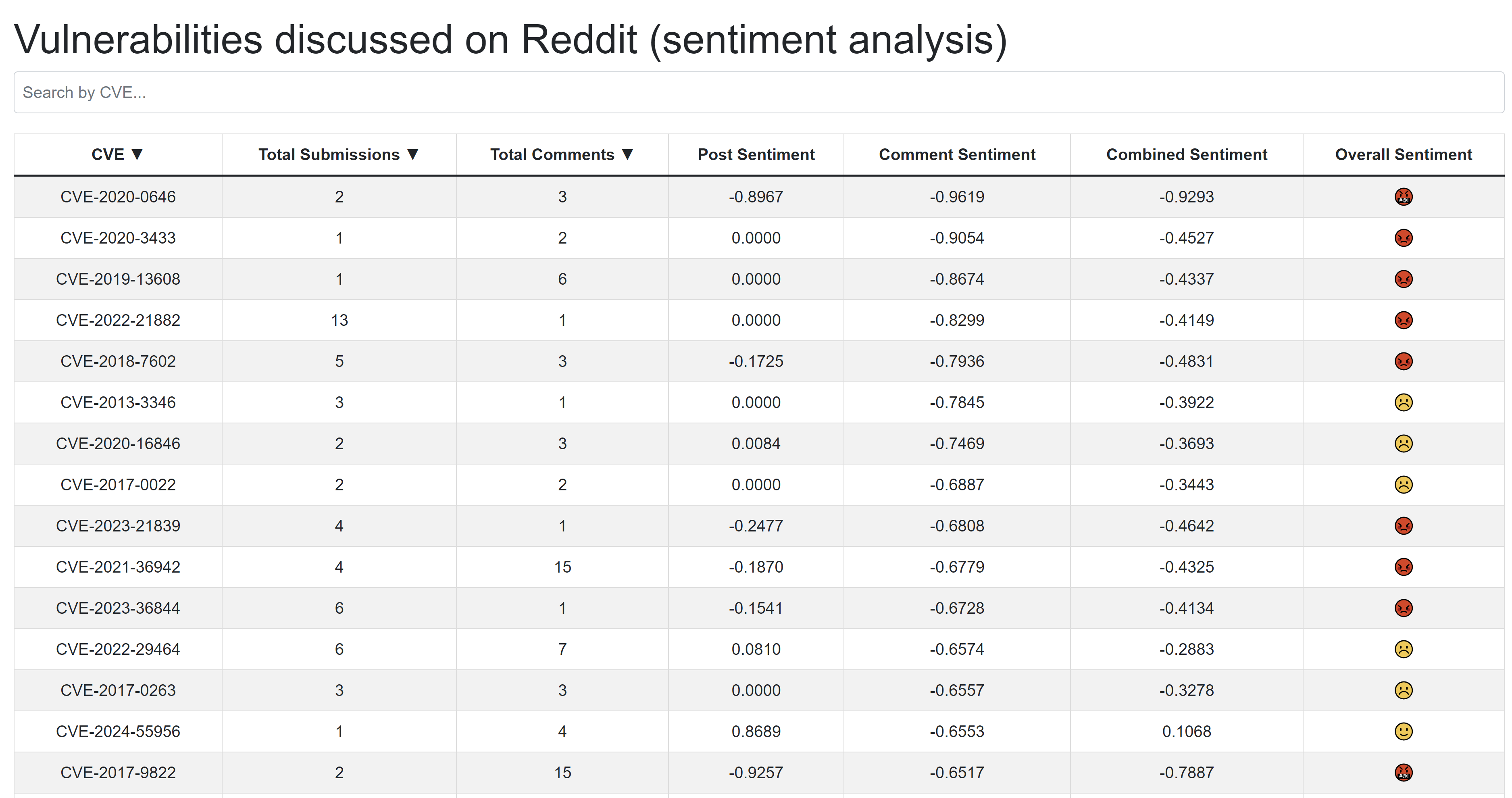 | CVE | Average Post Sentiment | Average Comment Sentiment | Average Overall Sentiment | Description |